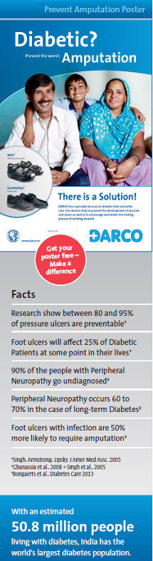 Welcome to the 14th issue of DARCO India NewsletterThis year's theme: "Save Limb, Save Life"Dear Reader, The 14th issue of the DARCO India newsletter coincides this year with the 14th annual DFSICON Congress. The Annual Conference of Diabetic Foot Society of India is the premiere gathering place for leaders in the scientific community. This will be DARCO's 3rd year contributing to the event. This year's conference will be held in Aurangabad and is hosted by the Aurangabad Diabetologists' Association on December 9 - 11 2016. The main focus of our subsidiary in India is to promote the exchange of medical knowledge in treating the foot and ankle; with an emphasis on the Diabetic foot and its related complications which are the leading causes of lower limb amputation throughout the world. DARCO's mission is to develop off-loading footwear for the prevention and the healing management for those who are at risk or suffer from foot ulcerations. |